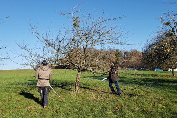 In einem Theorieteil beantworteten Peter Lutz (Streuobstberater der Landkreise Aschaffenburg und Miltenberg) und Manfred Knippel (Zertifizierter Landschaftsobstbaumpfleger) folgende Fragen: Warum breitet sich der Halbschmarotzerso rasant aus? Wird das begünstigt durch den Klimawandel? Wie erkenne ich einen kritischen Befall rechtzeitig und welche rechtlichen Rahmenbedingungen sind bei der Entfernung zu beachten? Auch wertvolle Informationen zu aktuellen Förderprogrammen und Tipps zur Organisation von kommunalen Mistelschnitttagen standen auf dem Lehrplan. In einem praktischen Teil übten die Teilnehmerinnen und Teilnehmer die fachgerechte Schnittführung. Außerdem diskutierten sie über verschiedene Techniken, um die Bäume langfristig zu entlasten, ohne sie durch zu starke Eingriffe zu schwächen.