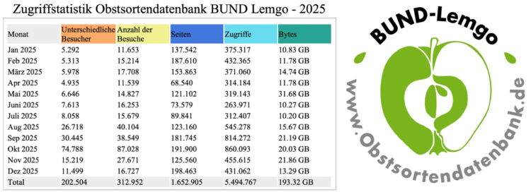 Die über Jahrzehnte von der Lemgoer Ortsgruppe für Umwelt und Naturschutz Deutschland aufgebaute Obstsortendatenbank gewinnt mehr und mehr an Bedeutung. Sie ist in ihrer Art einmalig und inzwischen europaweit verlinkt. Mit der Zahl von mehr als 202.000 unterschiedlichen Besuchern in 2025 erzielte die Ortsgruppe ein neues Rekordergebnis.