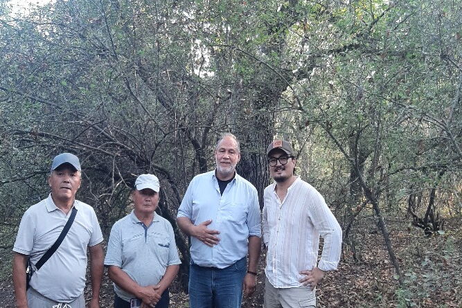 Der Leiter der Vermarktungsgenossenschaft Zairbek, Bauer Dairbek, Hannes Bürckmann von Hochstamm Deutschland und Toulos von der Vereinigung der Land- und Forstnutzer (von links) im Walnusswald.