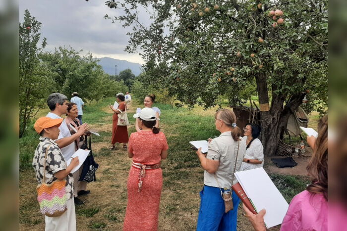 2025 ging es nun darum, diese „Kunst-Umwelt-Bildung“ für das Naturerbe Malus sieversii zu professionalisieren. Das Ziel: Ein Netzwerk von Anbieterinnen und Anbietern solcher Kunst- und Umweltaktionen. Dafür planten Hochstamm Deutschland e.V., Brigitte Hofherr und Azhar Jandossova ein Netzwerktreffen. Das fand im August 2025 im Botanischen Garten statt. Dabei waren Unternehmerinnen, Künstlerinnen, Lehrpersonen und Wissenschaftlerinnen. Forscherin Gauhar Mukan führte in den M. sieversii ein und zeigte dem Teilnehmerkreis die Bestände in der Versuchsanlage. Dort, zwischen den Bäumen mit reifen Äpfeln, zeigte Brigitte Hofherr den Teilnehmerinnen, wie sie bei ihren Kunstworkshops vorgeht, wenn sie Kindern und Jugendlichen an den Apfel heranführt. Hannes Bürckmann von Hochstamm Deutschland e.V. stellte im Anschluss Ansätze aus Deutschland vor, wie Naturbildung umgesetzt wird. Ein gutes Beispiel: der Verein Streuobstpädagogik e.V. Das Ergebnis des Tages: Die anwesenden Frauen sind hoch motiviert ein Netzwerk zu bilden. Am Folgetag des Netzwerktreffens war Tag der Offenen Tür im Botanischen Garten. Brigitte Hofherr bot bei dieser Gelegenheit nochmal Kunstworkshops für Kinder und Jugendliche an.